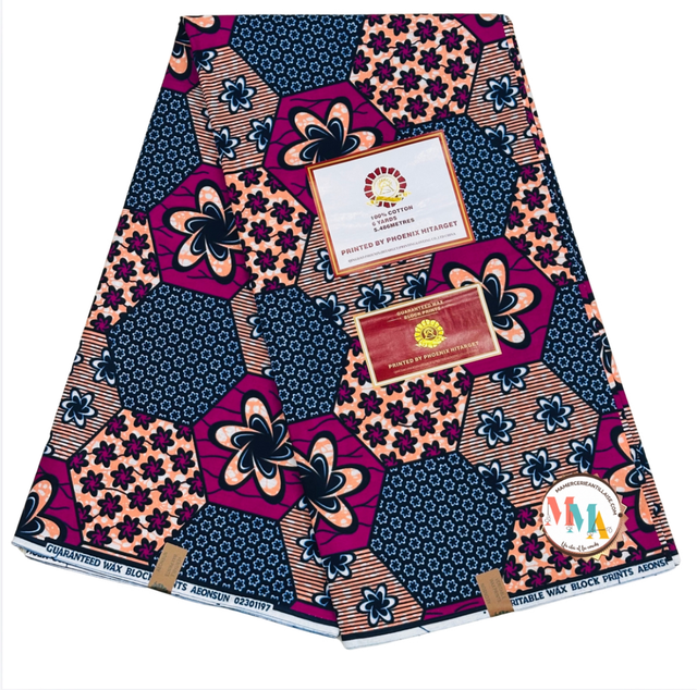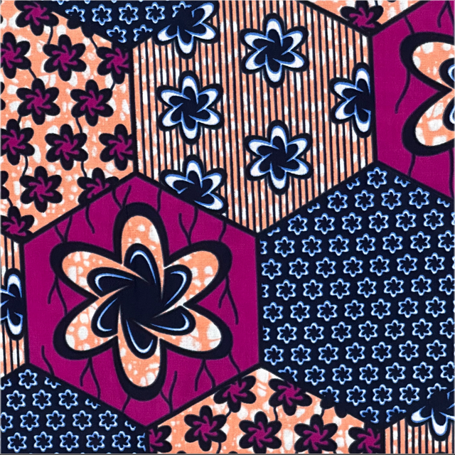 Wax Patchwork Fuchsia violacé Saumon marbré motifs fleuris Marine en tissu 100% Coton de 1m15 de large. Véritable Block Prints Super Wax, Marque Phoenix Hitarget Aeonsun vendu par coupon de +ou- 1m80.
