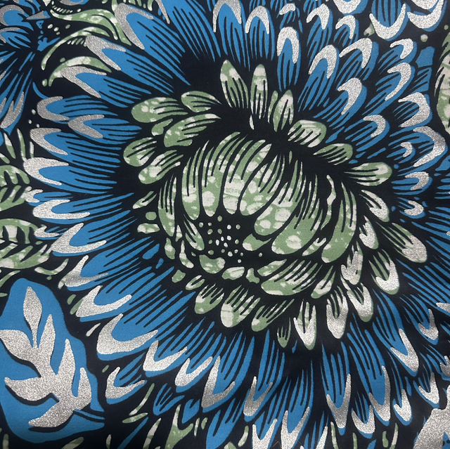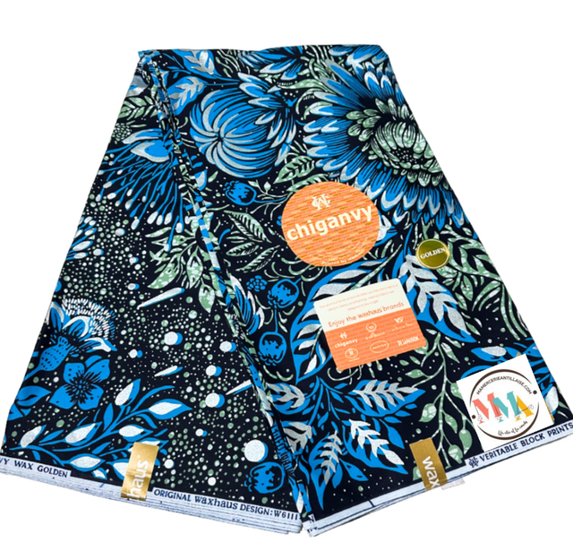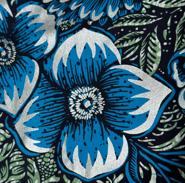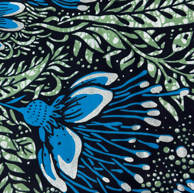 Wax Gold Bleu Noir Vert et argenté motifs floraux 100% Coton en 1m15 de large. Marque Chiganvy Waxhaus vendu par coupon de 5m40