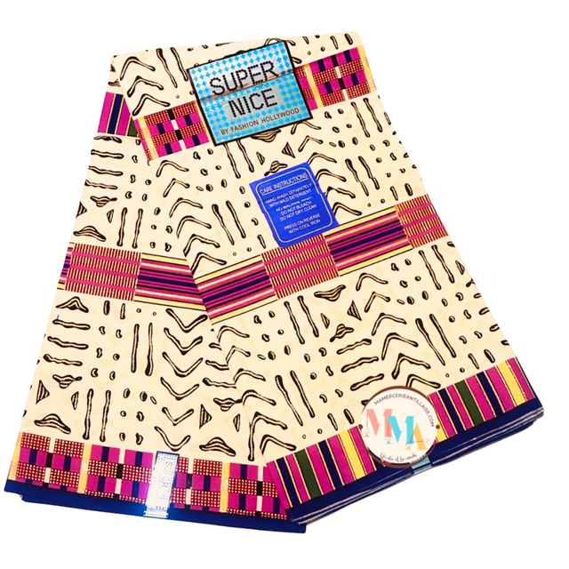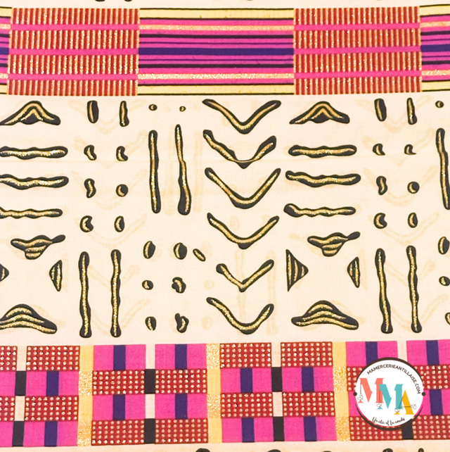 Wax Pailleté doré fond Jaune pâle motifs Noirs et rayé fuchsia Rouge Violet jaune et Noir en tissu 100% Coton de 1m15 de large. Super Nice Wax, Marque Fashion Hollywood vendu par coupon de 2m70.