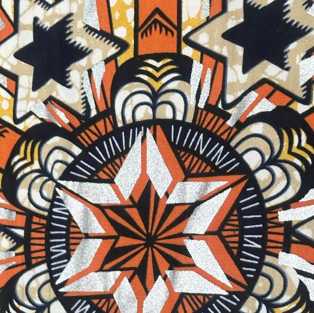 Wax marbré Beige Orange Noir motifs étoiles peinture argentée en tissu 100% Coton de 1m15 de large. Véritable Wax blocks marque vendu par coupon de 2m70.