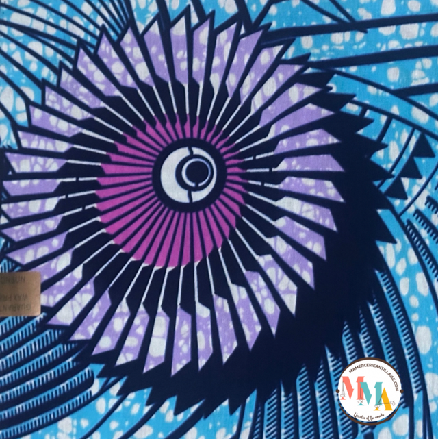 Wax motifs Parme Marine Fushia violacé sur fond turquoise marbré de blanc en tissu 100% Coton de 1m15 de large. Véritable Block Prints Super Wax, Marque Phoenix Hitarget Aeonsun vendu par coupon de 1m95.