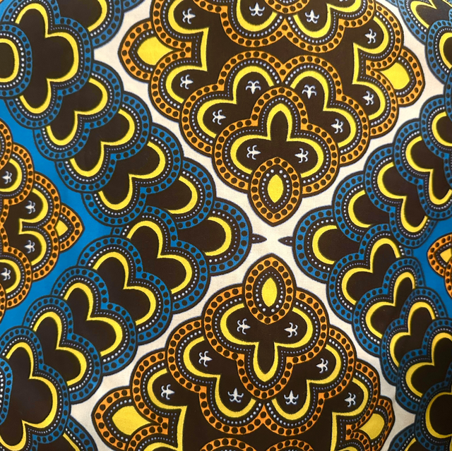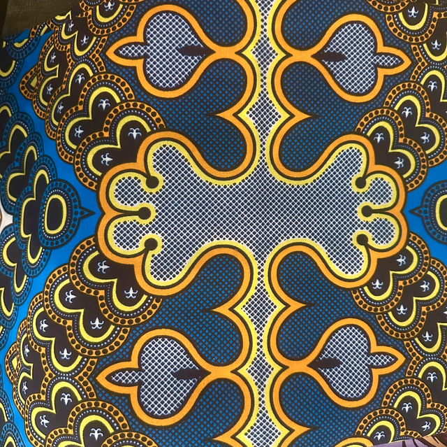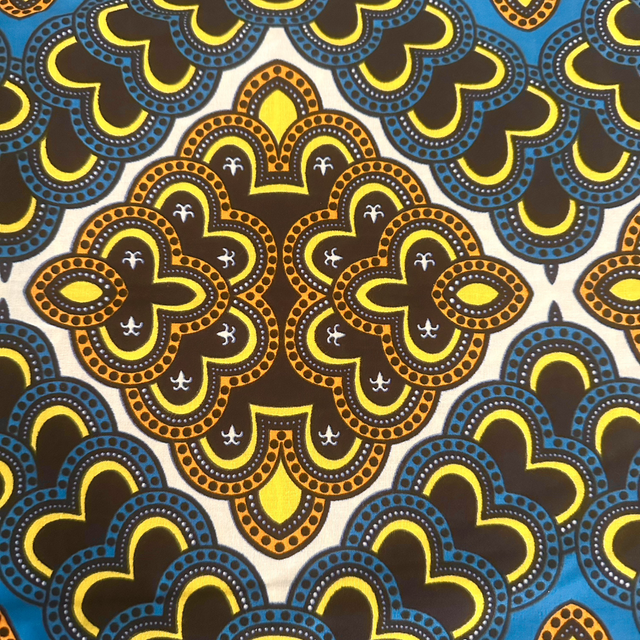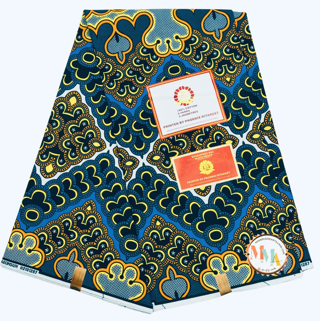 Wax fond Bleu Marine Abricot Blanc et Jaune citron en tissu 100% Coton de 1m15 de large. Véritable Block Prints Super Wax, Marque Phoenix Hitarget Aeonsun vendu par coupon de 1m80.