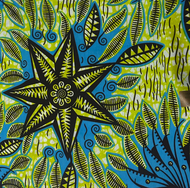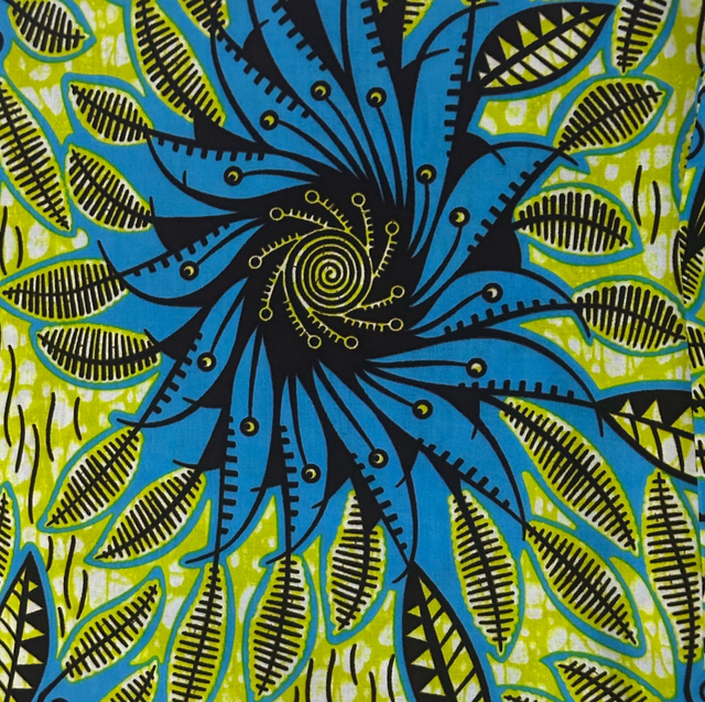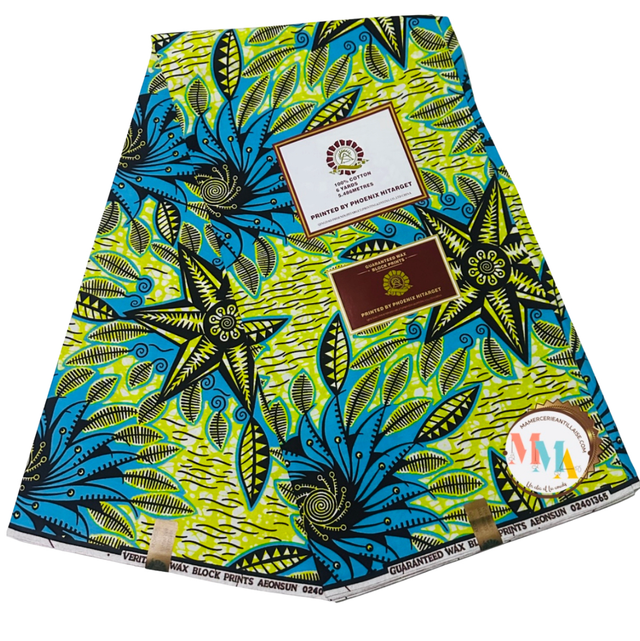 Wax fond Vert Anis motifs Bleu et Marron en 100% Coton en 1m15 de large. Véritable Block Prints Super Wax, Marque Phoenix Hitarget Aeonsun vendu par coupon de 5m40