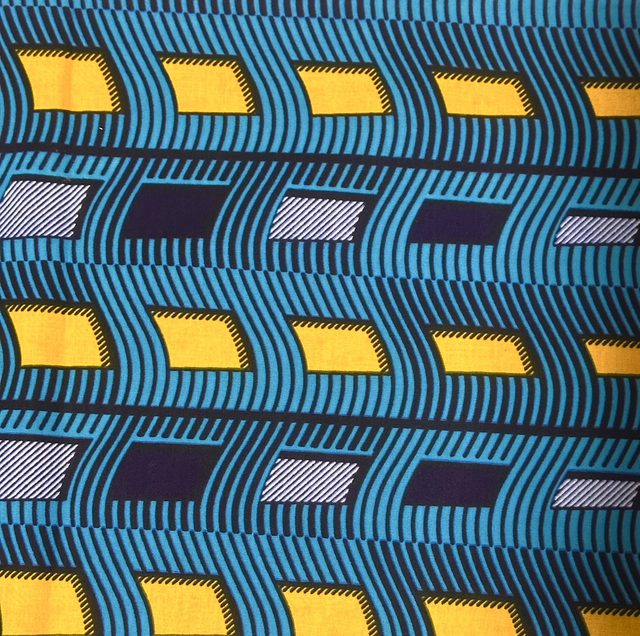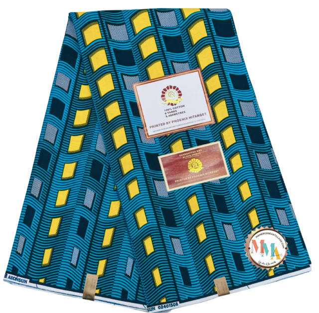 Wax Bleu Jaune Marine et Blanc en tissu 100% Coton de 1m15 de large. Véritable Block Prints Super Wax, Marque Phoenix Hitarget Aeonsun vendu par coupon de 2m70.