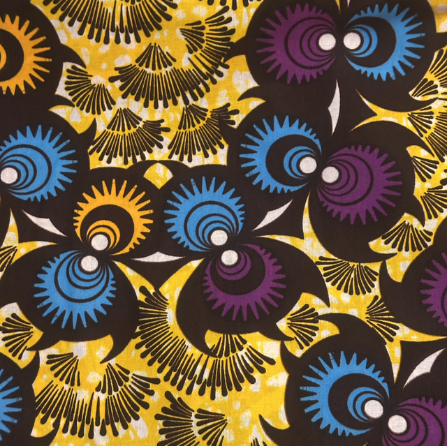 Wax fond jaune turquoise marron et Blanc en 100% Coton en 1m15 de large. Véritable Block Prints Super Wax, Marque Phoenix Hitarget Aeonsun vendu par coupon de 3m60.