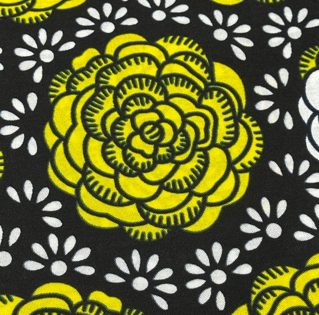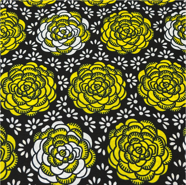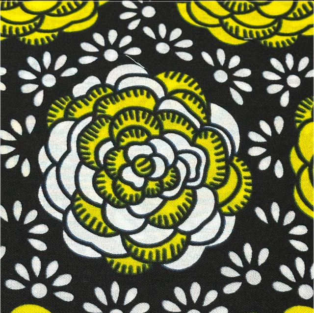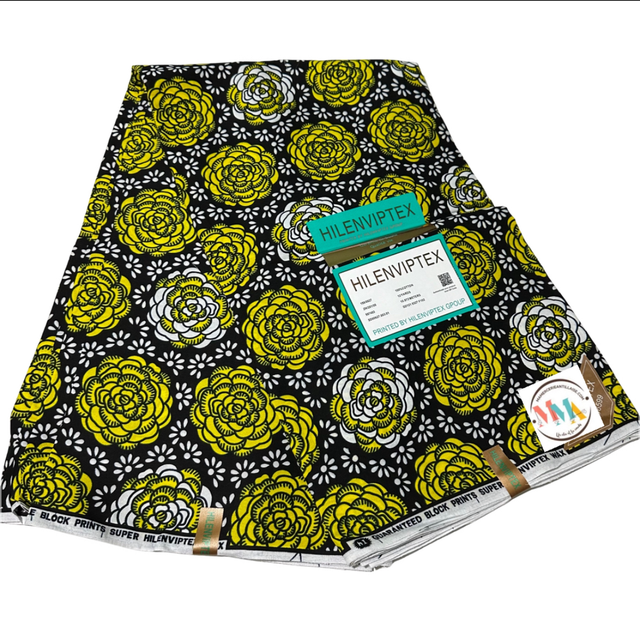 Wax Blanc Jaune citron Noir Polycoton en 1m15 de large. Véritable Block Prints Super Wax, Marque Hilenviptex vendu par coupon de 5m40
