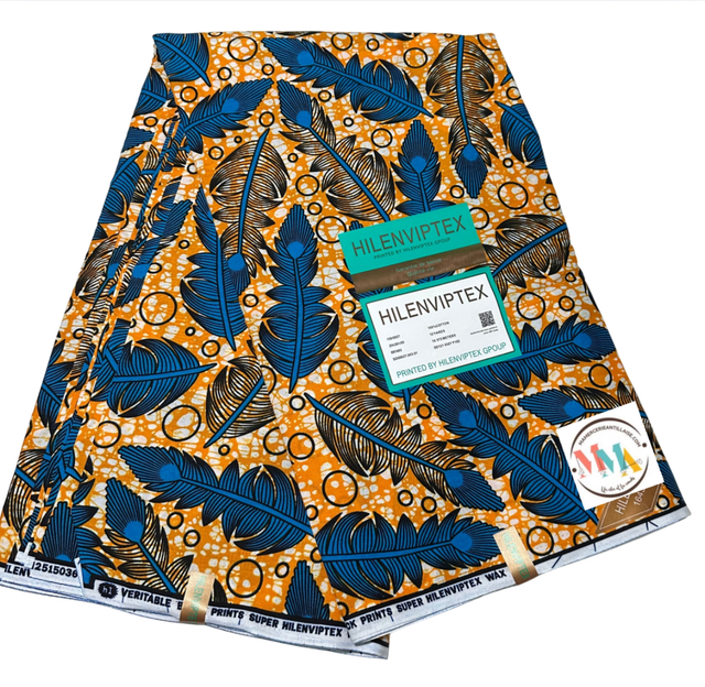 Wax Abricot Plumes Bleues et Noires PolyCoton en 1m15 de large. Ce tissu est un peu plus sec que les autres Wax. Véritable Block Prints Super Wax, Marque Hilenviptex vendu par mètre
