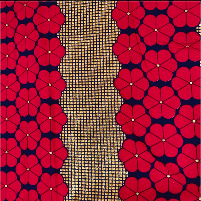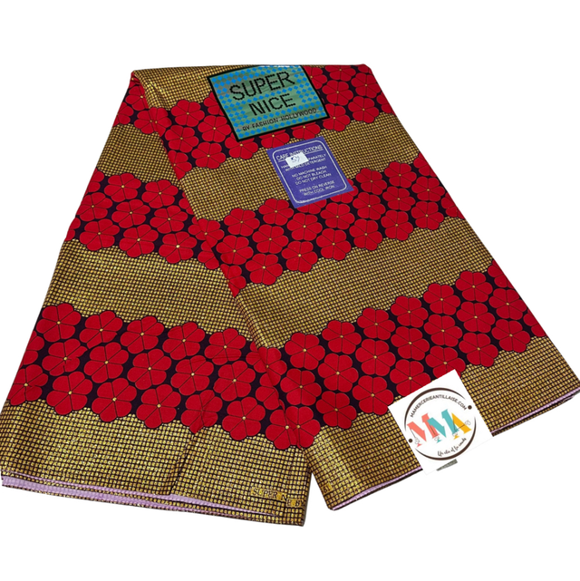 Wax fond Pailleté quadrillé Doré avec des bandes de fleurs en 100% Coton. Verticale Wax Blocks Super Nice marque By Fashion Hollywood vendu par coupon de 4m50.