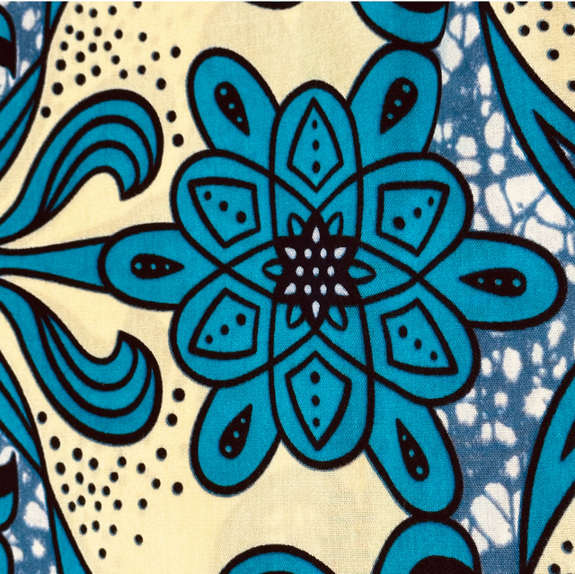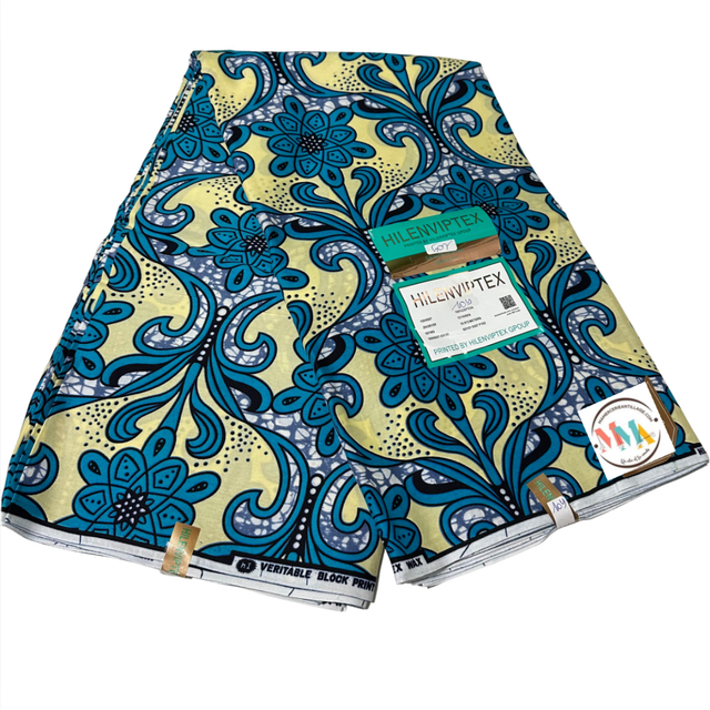 Wax Jaune pale Bleu marbré Gris 100% Coton en 1m15 de large. Véritable Block Prints Super Wax, Marque Hilenviptex vendu par coupon de 1m80.