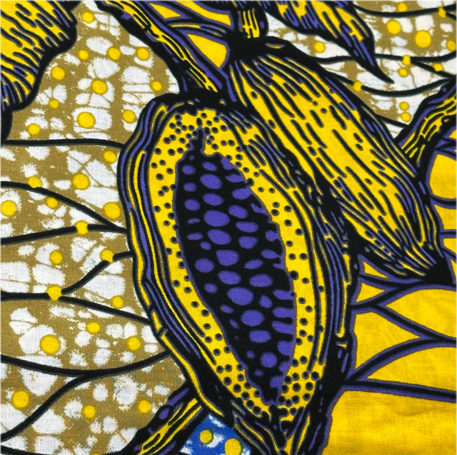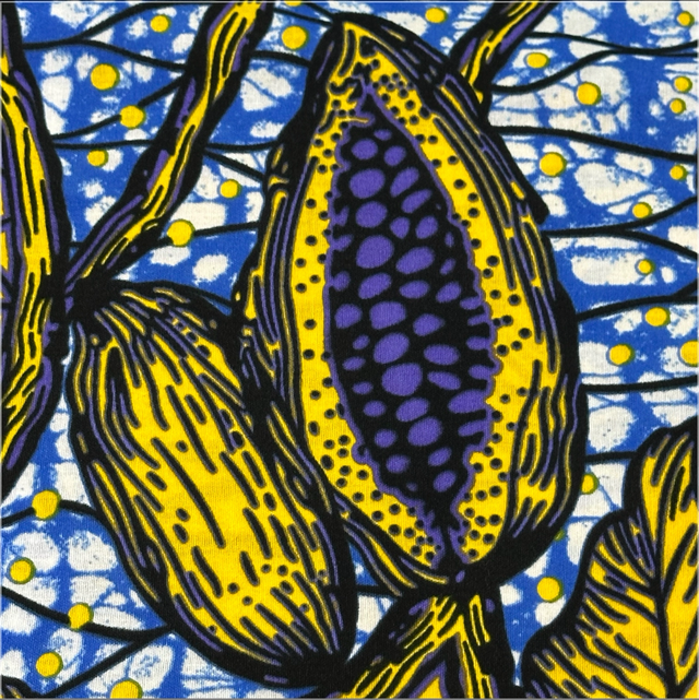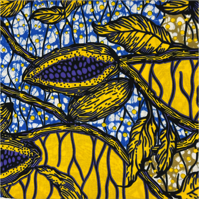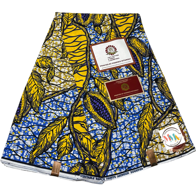 Wax Jaune Violet Bleu et Blanc en 100% Coton en 1m15 de large. Véritable Block Prints Super Wax, Marque Phoenix Hitarget Aeonsun vendu par coupon de 5m40