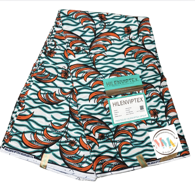 Wax Blanc Bleu-vert Orange et Noir en tissu Polycoton de 1m15 de large. Véritable Block Prints Super Wax, Marque Hilenviptex vendu par coupon de 1m80.