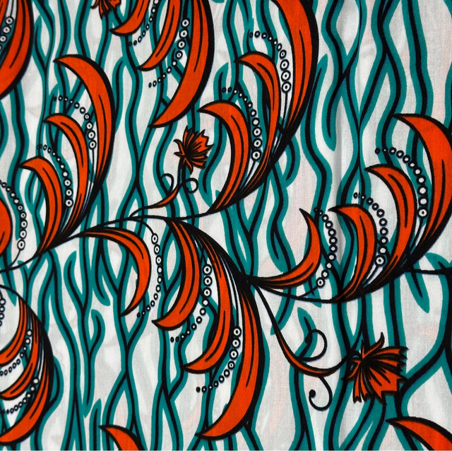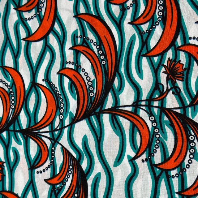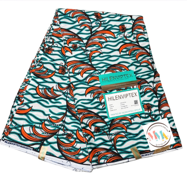 Wax Blanc Bleu-vert Orange et Noir Polycoton en 1m15 de large. Véritable Block Prints Super Wax, Marque Hilenviptex vendu par coupon de 5m40