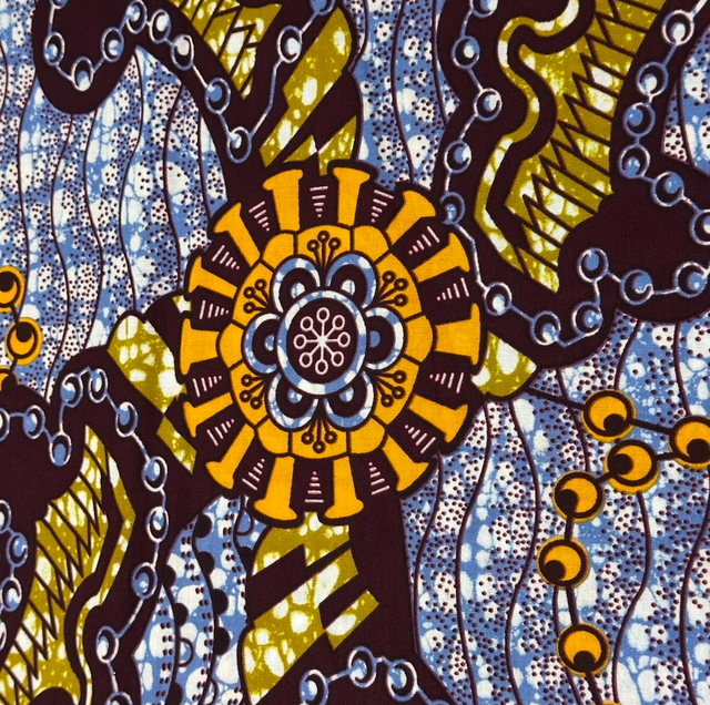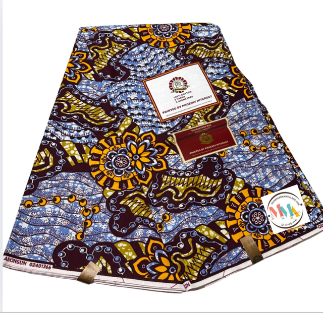 Wax Parme Jaune Ocre et Marron en 100% Coton en 1m15 de large.Véritable Block Prints Super Wax, Marque Phoenix Hitarget Aeonsun vendu par coupon de 2m70.