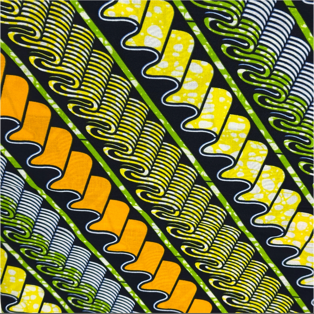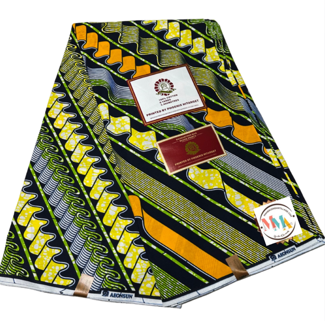 Wax Vert, jaune citron, jaune d’or, Noir et blanc en 100% Coton, tissu en 1m15 de large. Marque Phœnix Hitarget Aeonsû vendu par coupon de 5m40.