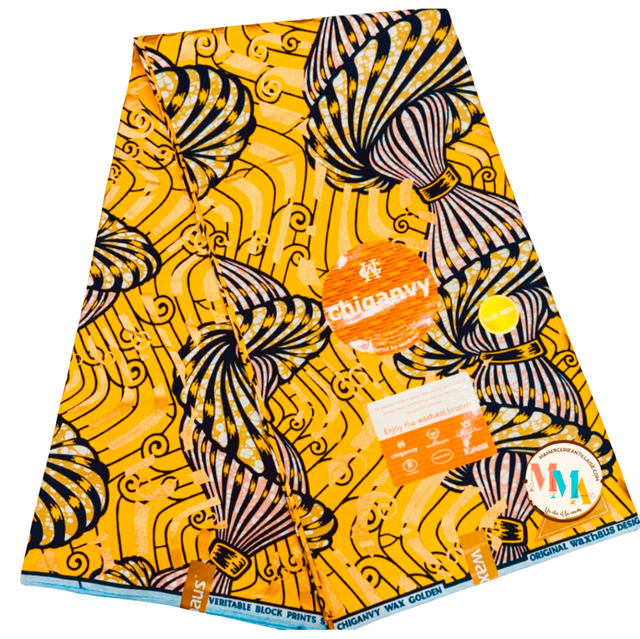 Wax Gold fond Jaune Motifs Rose et Beige marbrés et Noir en tissu 100% Coton de 1m15 de large. Marque Chiganvy Waxhaus vendu par coupon de 90cm.