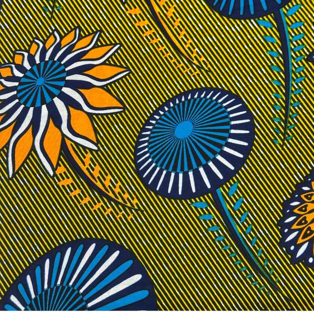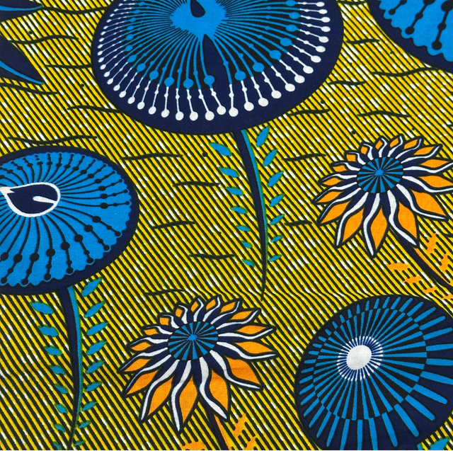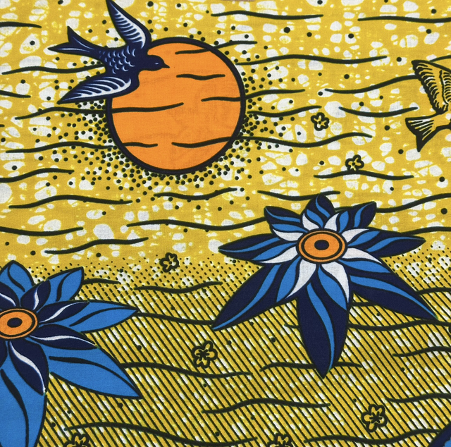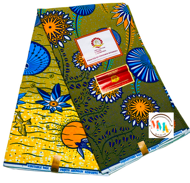 Wax fond jaune motifs Bleu Abricot scène de place 100% Coton en 1m15 de large. Véritable Block Prints Super Wax, Marque Phoenix Hitarget Aeonsun vendu par coupon de 5m40