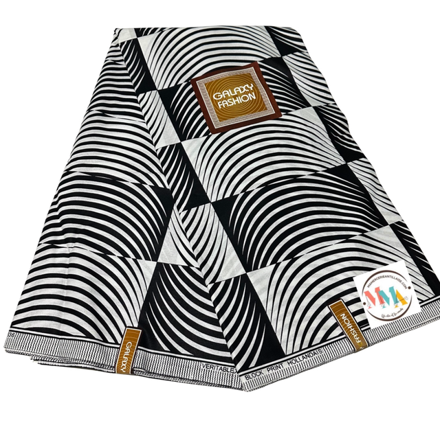 Wax fin motifs Bogolan motifs Zébrés Blancs et Noirs 100% Coton en 1m15 de large. Véritable Block Prints, Marque Galaxy Fashion vendu par coupon de 5m40.