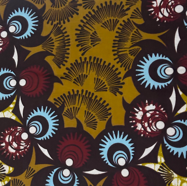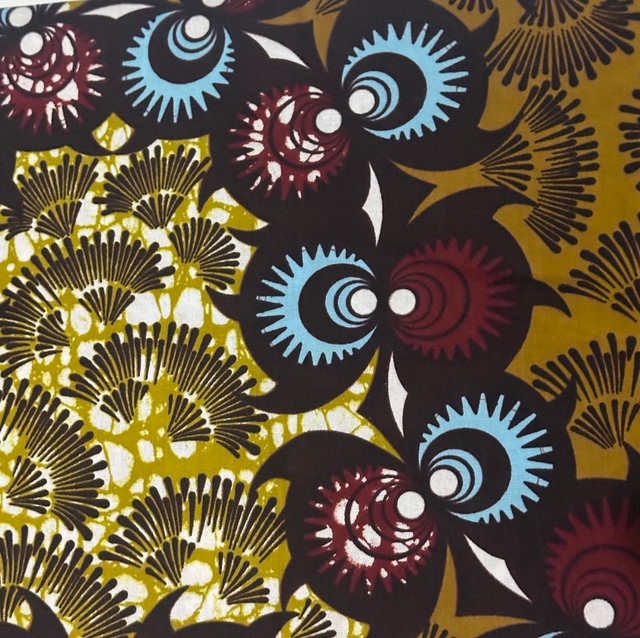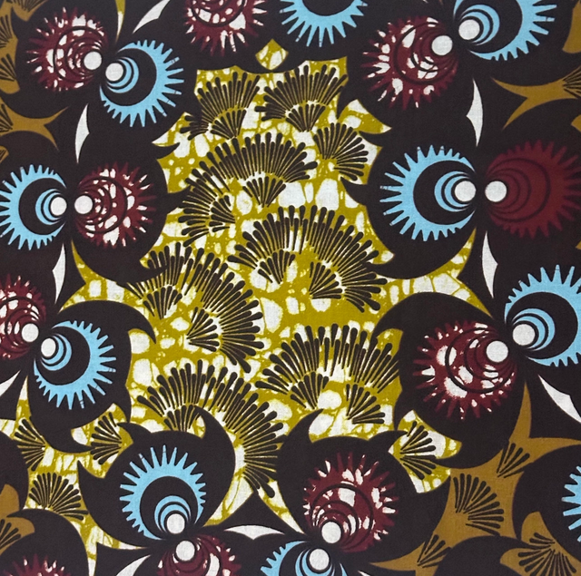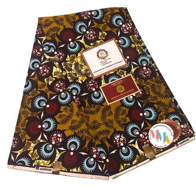 Wax Marron Bleu Caca d’oie et Blanc en 100% Coton en 1m15 de large. Véritable Block Prints Super Wax, Marque Phoenix Hitarget Aeonsun vendu par coupon de 5m40