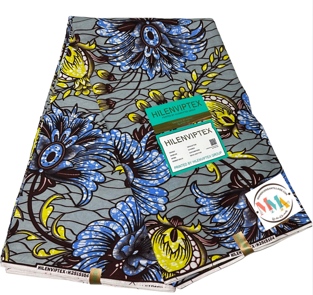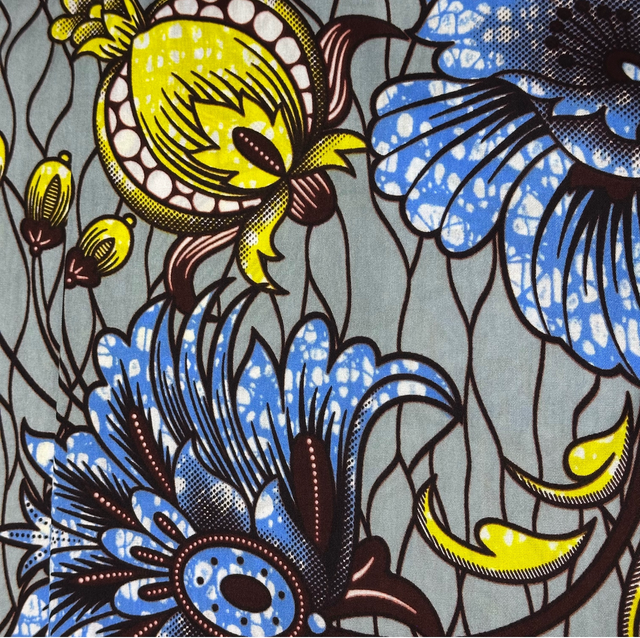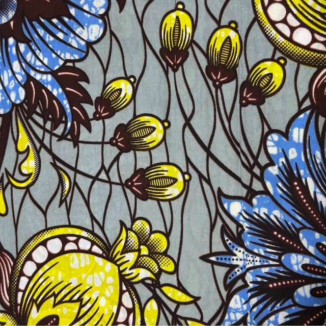 Wax Gris Fleuri Jaune-vert Lavande et Marron en tissu Polycoton de 1m15 de large. Véritable Block Prints Super Wax, Marque Hilenviptex vendu par coupon de 4m50.