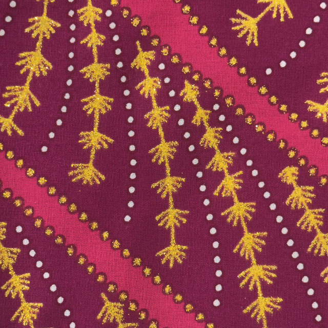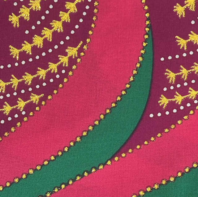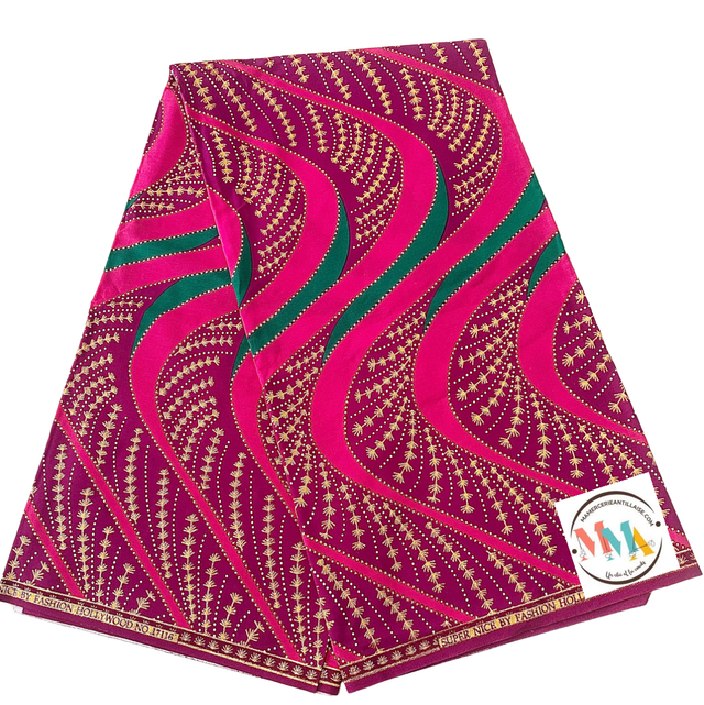 Wax Bordeau-rosé Fuchsia foncé et Vert avec des guirlandes Pailleté Doré, tissu 100% Coton de 1m15 de large. Véritable Wax Blocks Super Nice marque By Fashion Hollywood vendu par coupon de 1m80.