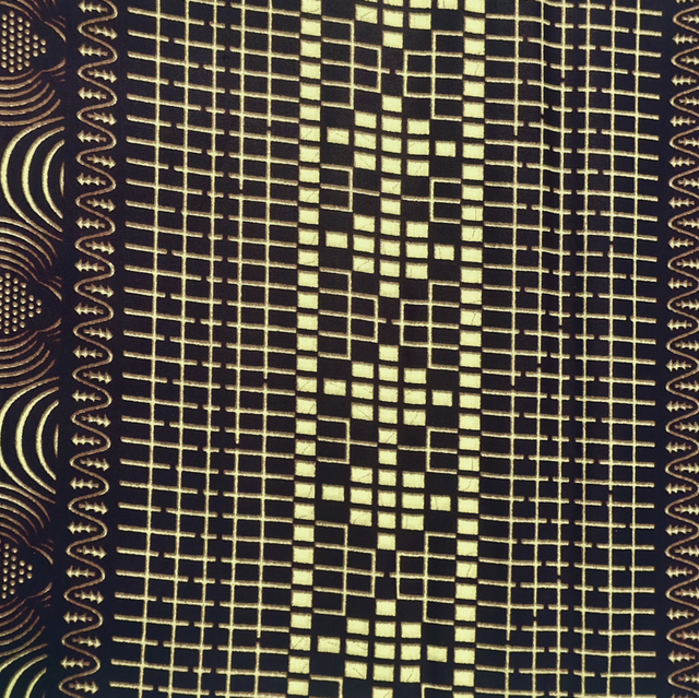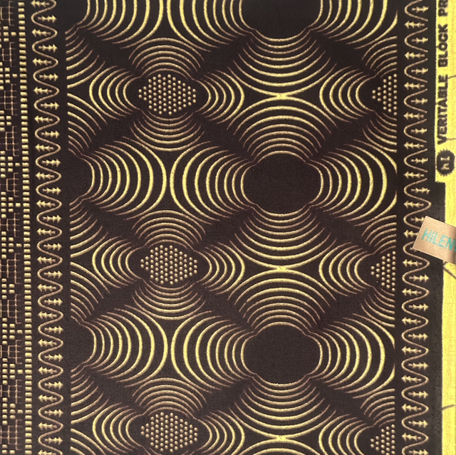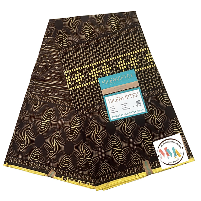 Wax ciré Marron et jaune citron en tissu 100% Coton de 1m15 de large. Véritable Block Prints Super Wax, Marque Hilenviptex vendu par coupon de 5m40